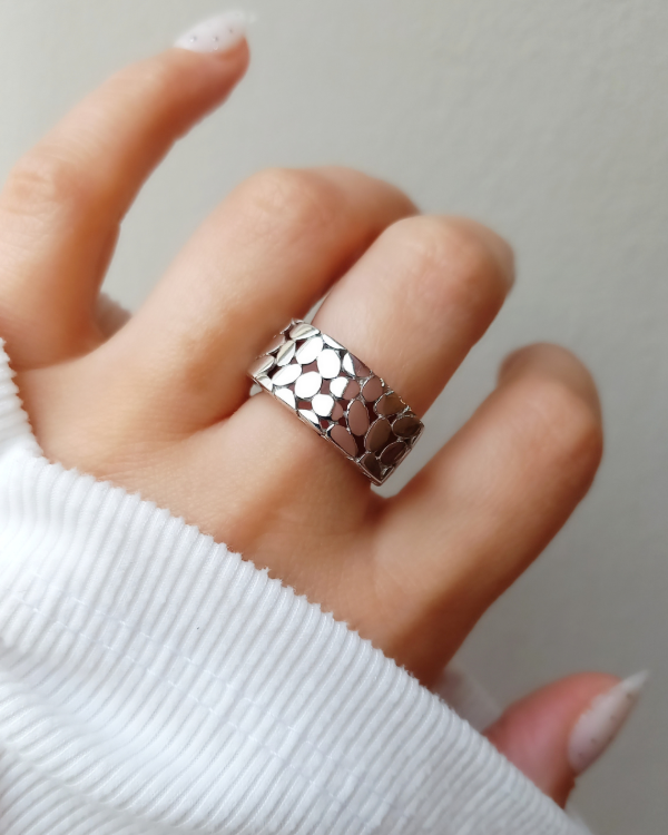Anillo con cuerpo ancho con detalles en círculos y calado.